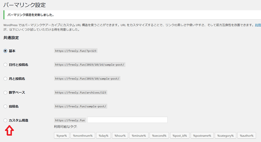 - パーマリンクはカスタム構造にチェックを入れて /%postname% を入力
